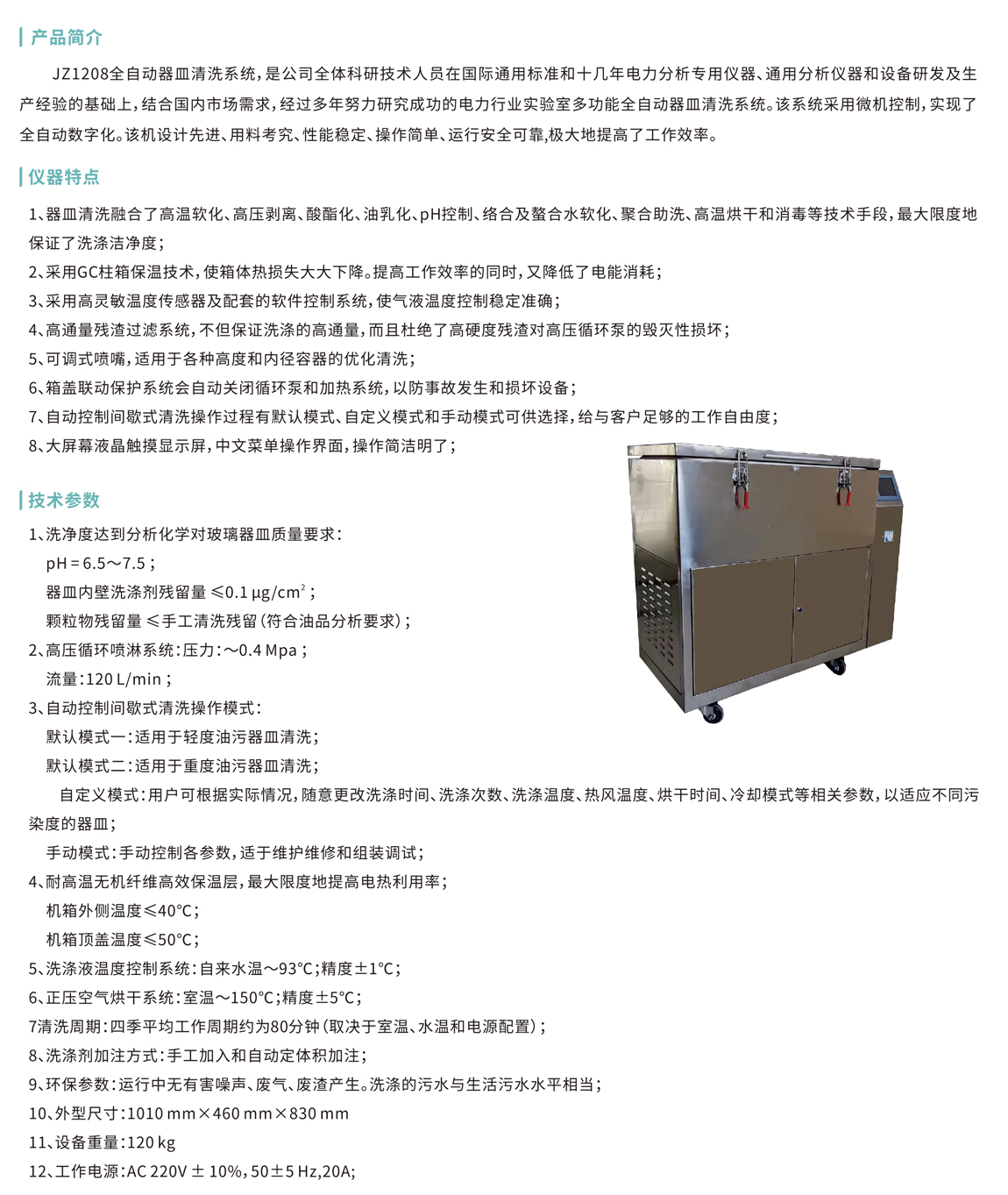 JZ1208全自動器皿清洗系統,是公司全體科研技術人員在國際通用標準和十幾年電力分析專用儀器、通用分析儀器和設備研發及生 產經驗的基礎上,結合國內市場需求,經過多年努力研究成功的電力行業實驗室多功能全自動器皿清洗系統。該系統采用微機控制,實現了 全自動數字化。該機設計先進、用料考究、性能穩定、操作簡單、運行安全可靠,極大地提高了工作效率。