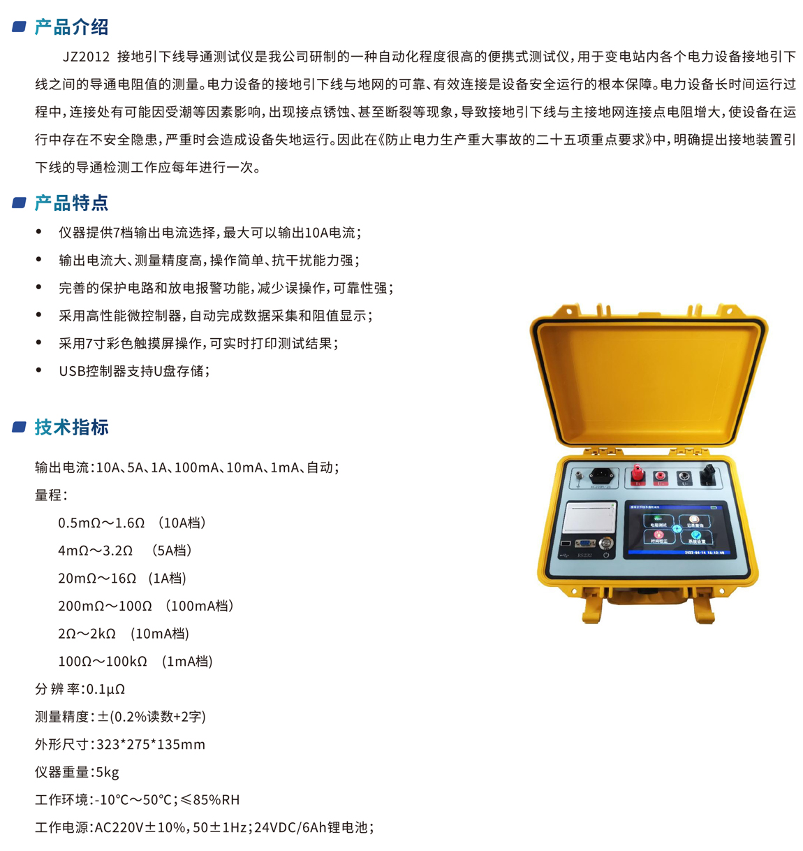 JZ2012接地引下線導通測試儀是我公司研制的一種自動化程度很高的便攜式測試儀,用于變電站內各個電力設備接地引下