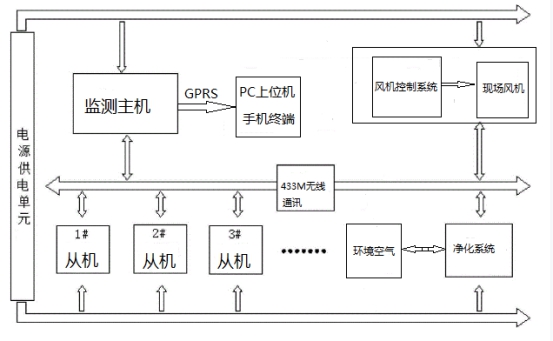 多功能環境遠程監測凈化系統包括一個主機、多個從機采集系統、風機控制系統以及凈化系統這四部分組成。